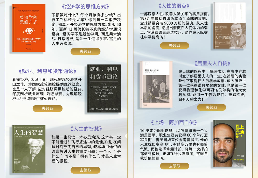 華為閱讀與國(guó)航共同精選了適合旅途閱讀的“國(guó)航伴讀書單”,包括《經(jīng)濟(jì)學(xué)的思維方式》、《就業(yè)、利息和貨幣通論》、《人生的智慧》、《人性的弱點(diǎn)》、《居里夫人自傳》、《上場(chǎng):阿加西自傳》等好評(píng)付費(fèi)書籍,并提供給國(guó)航用戶免費(fèi)閱讀,為乘客的飛行時(shí)光帶來更多精神享受。