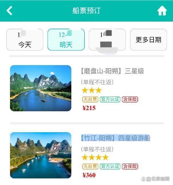 進一步來看,漓江風景區(qū)船票購買界面提供的215元的“【磨盤山-陽朔】三星級”和360元的“【竹江-陽朔】四星級游船”選項中,雖然顯示“含保險”,但并未說明保費與承保的保險公司,乃至保障責任等信息。