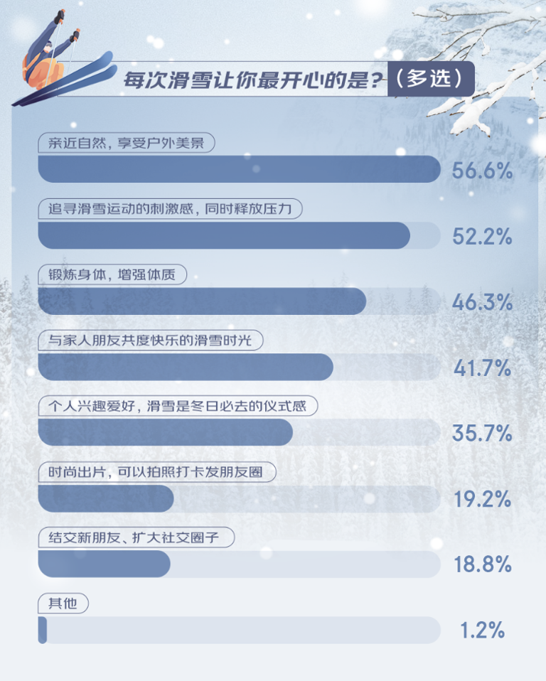 來自深圳的年輕程序員林小嫻是一名滑雪發(fā)燒友。自前年自己首次嘗試滑雪,便被雪道上飛馳的自由與刺激深深吸引,她感慨地說:“滑雪讓我重新定義了冬季的樂趣,每一次滑行都是一次心靈的釋放。”在調(diào)研中,許多人表達(dá)了對滑雪帶來的自由、挑戰(zhàn)與樂趣的深切熱愛,有56.6%的人表示,親近自然、享受美景是他們滑雪時最開心的時刻;52.2%的人渴望追尋滑雪運(yùn)動的刺激感、釋放壓力;此外,強(qiáng)身健體、與家人朋友共度時光、結(jié)交新朋友也是滑雪讓人開心的體驗。