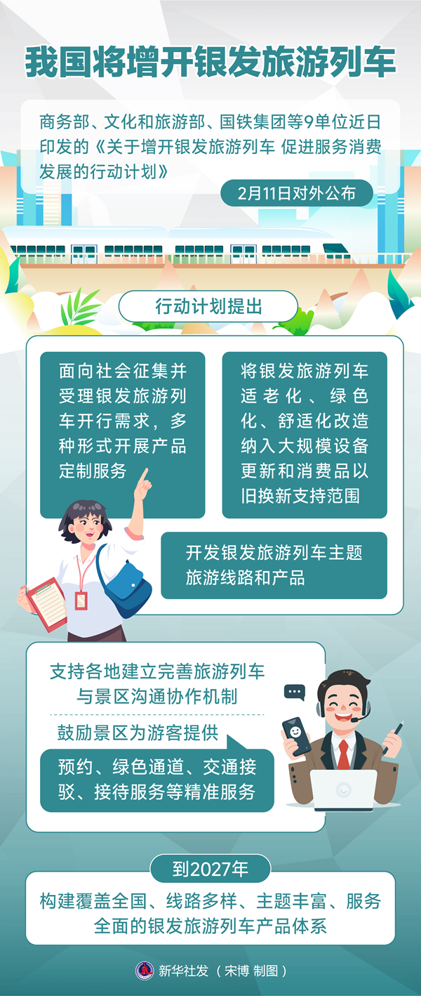 商務(wù)部、文化和旅游部、國鐵集團(tuán)等9單位近日印發(fā)的《關(guān)于增開銀發(fā)旅游列車 促進(jìn)服務(wù)消費(fèi)發(fā)展的行動(dòng)計(jì)劃》11日對(duì)外公布,從增加銀發(fā)旅游列車服務(wù)供給、強(qiáng)化適老化設(shè)施保障、提升銀發(fā)旅游列車服務(wù)水平、優(yōu)化銀發(fā)旅游列車發(fā)展環(huán)境等方面提出12條具體舉措。