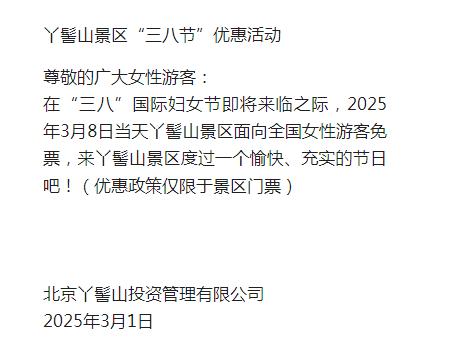 2025年3月8日當(dāng)天丫髻山景區(qū)面向全國女性游客免票(優(yōu)惠政策僅限于景區(qū)門票)