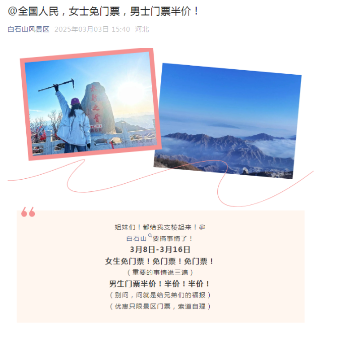 2025年3月8日-3月16日,女士免門票,男士門票半價(jià)(優(yōu)惠只限景區(qū)門票)