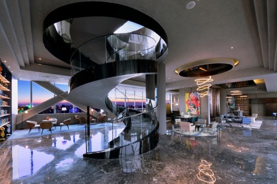 高空視野:31樓全透明云端餐廳可俯瞰人民南路車水馬龍,180°落地窗將城市天際線化為流動畫卷;旋轉(zhuǎn)樓梯以光影裝置串聯(lián)空間敘事,每一步皆成風景。