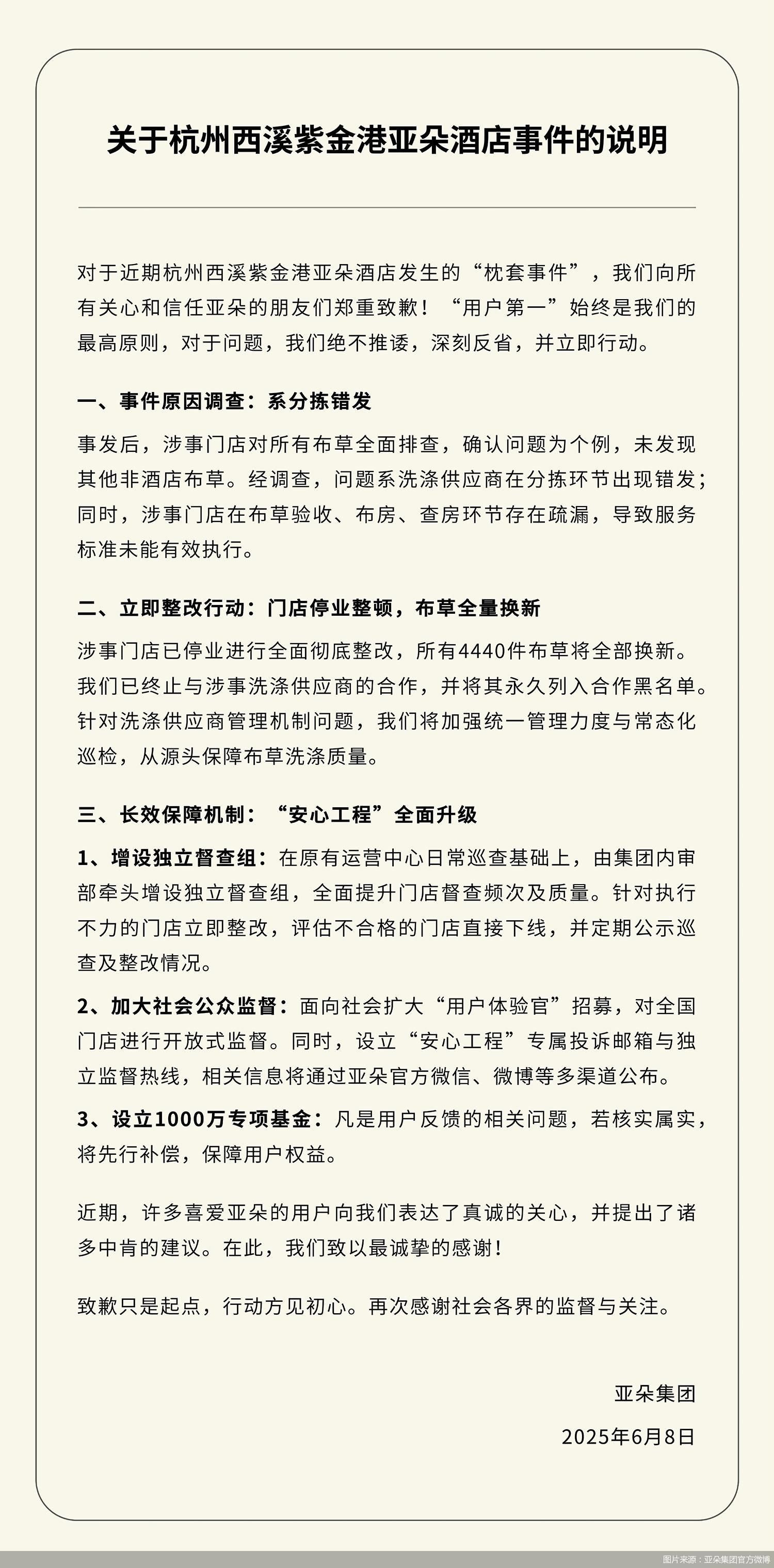 6月8日,據(jù)“亞朵集團(tuán)”官方微博消息,亞朵集團(tuán)發(fā)布關(guān)于杭州西溪紫金港亞朵酒店事件的說明,對(duì)于近期杭州西溪紫金港亞朵酒店發(fā)生的“枕套事件”,亞朵集團(tuán)向所有關(guān)心和信任亞朵的朋友們鄭重致歉。事發(fā)后,涉事門店對(duì)所有布草全面排查,確認(rèn)問題為個(gè)例,未發(fā)現(xiàn)其他非酒店布草。經(jīng)調(diào)查,問題系洗滌供應(yīng)商在分揀環(huán)節(jié)出現(xiàn)錯(cuò)發(fā);同時(shí),涉事門店在布草驗(yàn)收、布房、查房環(huán)節(jié)存在疏漏,導(dǎo)致服務(wù)標(biāo)準(zhǔn)未能有效執(zhí)行。