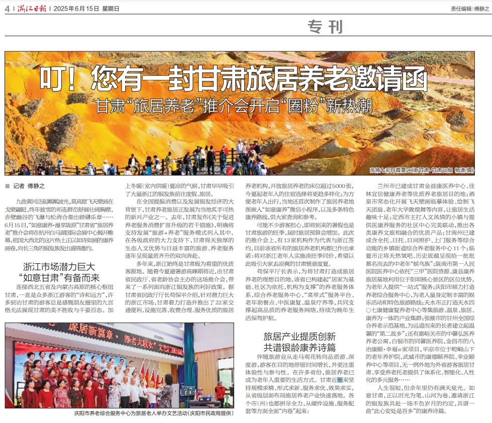 作為中國最大的游客輸出省之一,浙江始終是甘肅極為看重的優(yōu)質客源地。隨著2025年度的夏季避暑游高峰期將近,6月15日,“如意康養(yǎng)·漫享隴原”甘肅省“旅居養(yǎng)老”推介會正式走進杭州,本次大會由甘肅省民政廳、甘肅省老齡協(xié)會主辦,甘肅省福利彩票發(fā)行管理中心協(xié)辦,來自浙隴兩地民政部門、養(yǎng)老機構、旅行社、新聞媒體圈的數百位嘉賓與市民游客參加了本次推介活動。