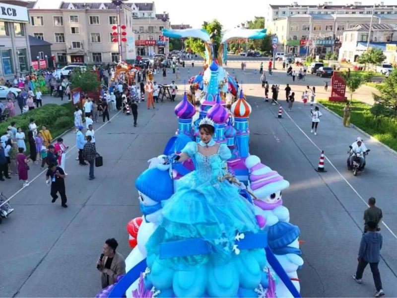 巡游隊伍中,47名專業(yè)演員的表演同樣精彩紛呈。“金翎飛霄”方陣的男演員們身著女真武士鎧甲,手持長矛跳起剛勁有力的戰(zhàn)舞;“鐘林毓秀”方陣的女演員則化身森林精靈,輕盈的舞步配合著花車上搖曳的藍莓枝椏,演繹出林間仙境的唯美畫面。演員們還不時走下花車與觀眾互動,教小朋友模仿鄂倫春族的傳統(tǒng)舞蹈動作,現(xiàn)場笑聲不斷。