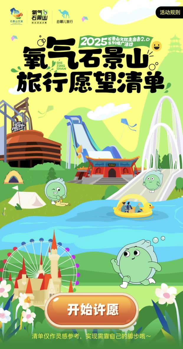 在“去哪兒”旅行APP上線“氧氣石景山”文旅專題頁(yè),不僅整合酒店榜單、景區(qū)門(mén)票、優(yōu)質(zhì)攻略等核心文旅資源,更特別設(shè)置石景山區(qū)對(duì)口支援和協(xié)作地文旅產(chǎn)品版塊,實(shí)現(xiàn)“石景山推廣+支援地區(qū)助銷”雙重價(jià)值。同步推出的“旅行打卡愿望清單”H5,線上用戶可點(diǎn)亮自己的石景山旅游心愿,生成專屬旅行愿望清單;在高校路演活動(dòng)中,大學(xué)生可分享H5到社交媒體作為參與活動(dòng)的入場(chǎng)券——既為高;顒(dòng)預(yù)熱,更成為高校路演入場(chǎng)憑證,串聯(lián)起“線上互動(dòng)-線下參與”的閉環(huán)。
