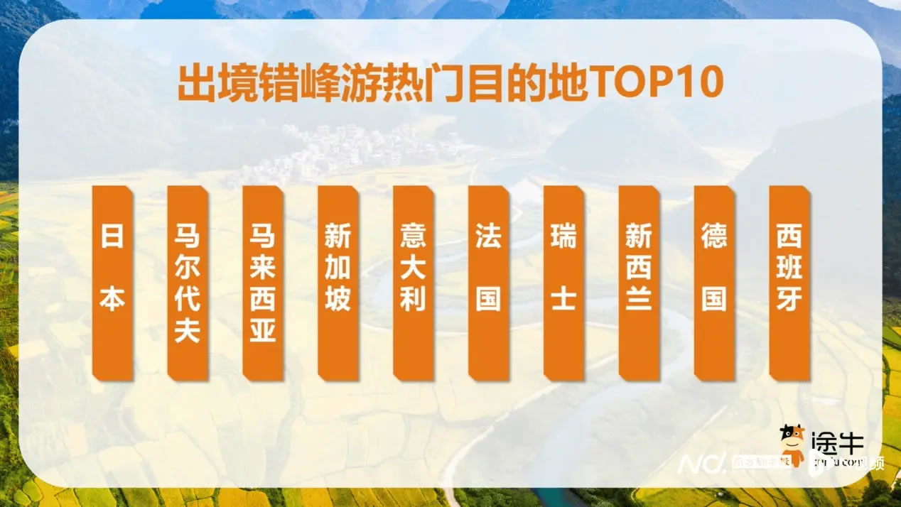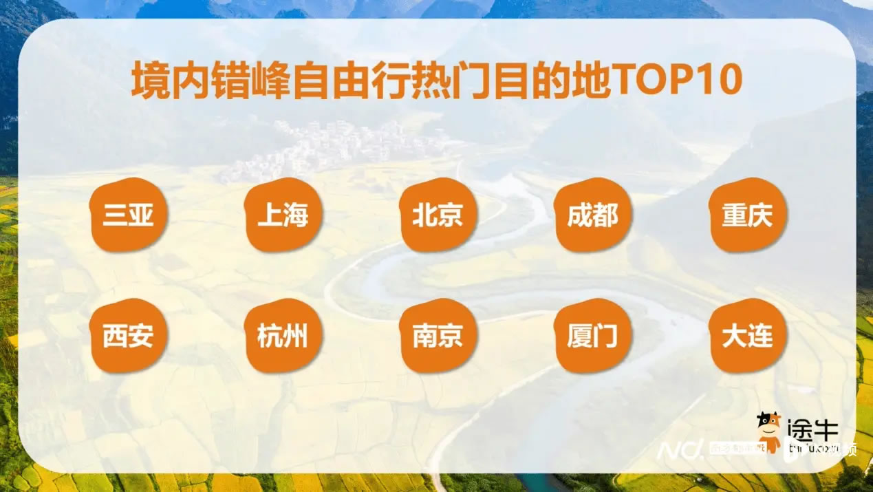 境內(nèi)錯(cuò)峰游仍是多數(shù)游客的首選,途牛平臺(tái)上境內(nèi)出游人次占比超過70%。熱門目的地包括上海、北京、三亞、成都、廣州、杭州、西安、南京、重慶、黃山等地。