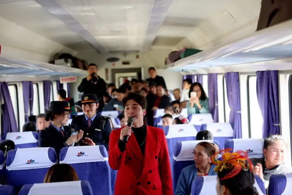 火車(chē)上,《和田是個(gè)好地方》《新疆姑娘》《祝福祖國(guó)亞克西》等經(jīng)典文藝節(jié)目輪番上演,悠揚(yáng)的旋律和深情的演唱打動(dòng)著在場(chǎng)的每一位旅客,讓車(chē)廂成為流動(dòng)的舞臺(tái)。文藝表演結(jié)束后,文旅資源宣傳推介環(huán)節(jié)緊隨其后,工作人員通過(guò)生動(dòng)講解與展示,帶領(lǐng)旅客提前領(lǐng)略和田的獨(dú)特風(fēng)光與人文魅力。此外,宣講人員還用接地氣的家常話、互動(dòng)感十足的小問(wèn)答,把理論知識(shí)講得鮮活有趣,讓旅客們?cè)诼猛镜乃槠瑫r(shí)光里,既能放松休憩,又能輕松收獲思想啟迪,讓出行多了一份別樣的“精神補(bǔ)給”。