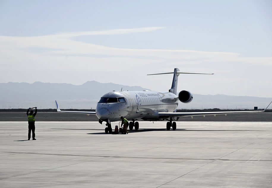 10月26日,敦煌至哈密冬春航季首航航班降落在敦煌莫高國際機場。 新華社發(fā)(張曉亮攝)