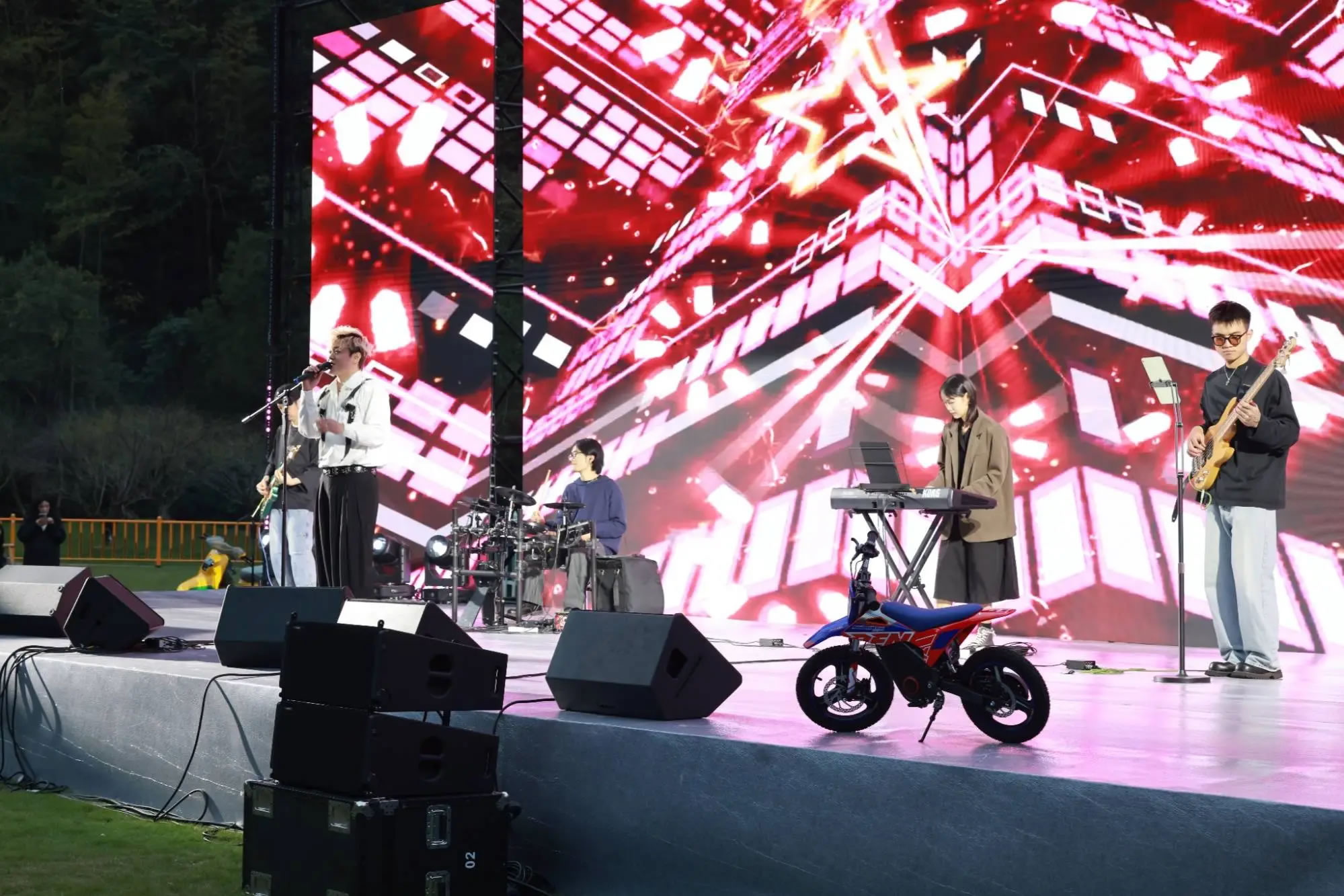 隨著機車隊伍陸續(xù)抵達,十九峰大草坪迅速化身為音樂狂歡的海洋。從午后到夜晚,舞臺持續(xù)高能輸出。搖滾樂隊點燃全場熱情,流行金曲引發(fā)集體合唱。