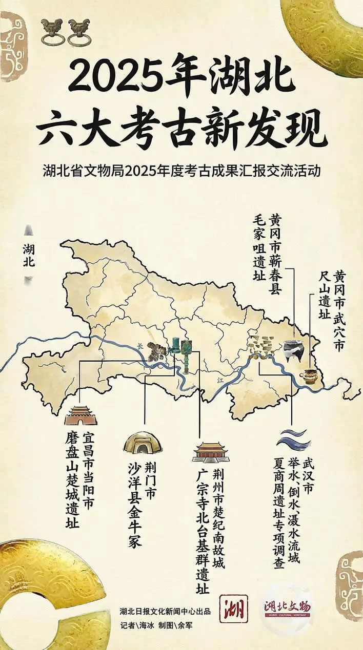 2月3日,在湖北省文物局舉辦的2025年度湖北省考古成果匯報(bào)交流活動(dòng)上,正式公布了2025年湖北六大考古新發(fā)現(xiàn)。分別為:黃岡市武穴市尺山遺址、黃岡市蘄春縣毛家咀遺址、宜昌市當(dāng)陽(yáng)市磨盤山楚城遺址、荊州市楚紀(jì)南故城廣宗寺北臺(tái)基群遺址、荊門市沙洋縣金牛冢及武漢市舉水、倒水、灄水流域夏商周遺址專項(xiàng)調(diào)查。