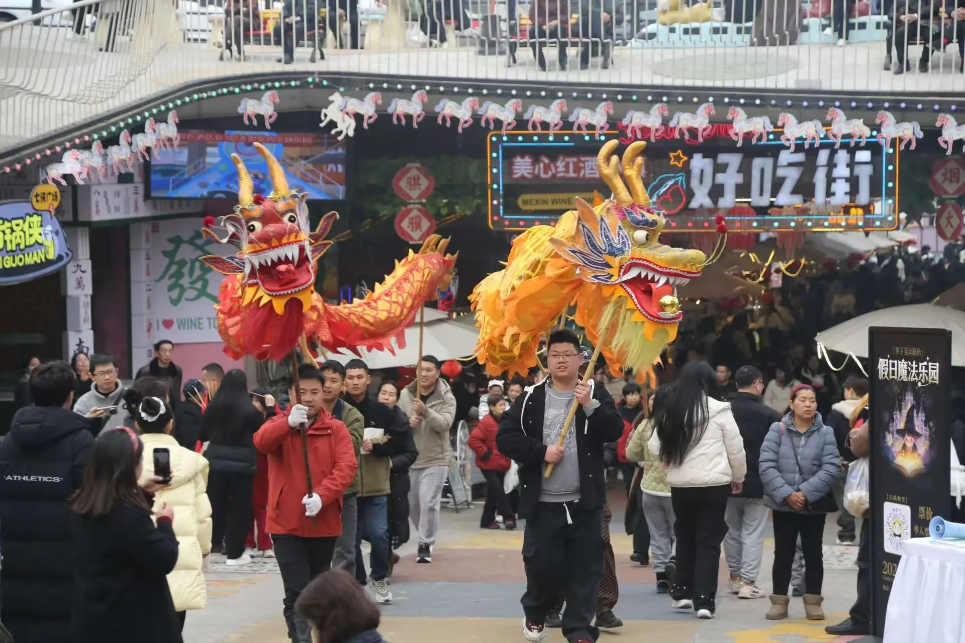 涪陵美心紅酒小鎮(zhèn)景區(qū)更是打破傳統(tǒng)景區(qū)“臺上表演、臺下觀看”的模式,全面轉(zhuǎn)向以游客為主導(dǎo),全民參與、沉浸式互動的新春玩法,把游客真正“寵”進(jìn)濃濃年味里。除了舞龍舞獅、民俗巡游、財(cái)神送福等經(jīng)典項(xiàng)目外,游客還可以穿戲服、持龍具、跟著鼓點(diǎn)一起巡游,親身感受傳統(tǒng)年俗的熱鬧與儀式感,從“圍觀者”變身“參與者”,讓年味更足、歡樂加倍。15日至17日,景區(qū)人氣持續(xù)火爆,日均接待游客超6萬人次,成為重慶近郊新春出游的熱門之選。