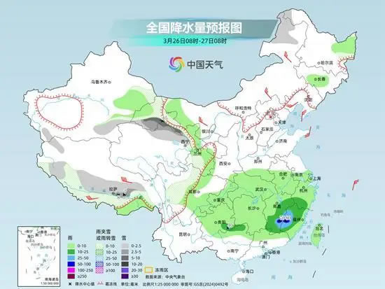 隨著低空急流明顯增強,南方降雨進入顯著時段。監(jiān)測顯示,25日8時至26日6時,湖北西南部、貴州東部、湖南北部、江西北部等地出現(xiàn)中到大雨,局地暴雨。此外,新疆東部、青海東部和南部、西藏東部、甘肅東南部、四川西北部等地部分地區(qū)出現(xiàn)小到中雪或雨夾雪,新疆、甘肅等局地大雪或暴雪。