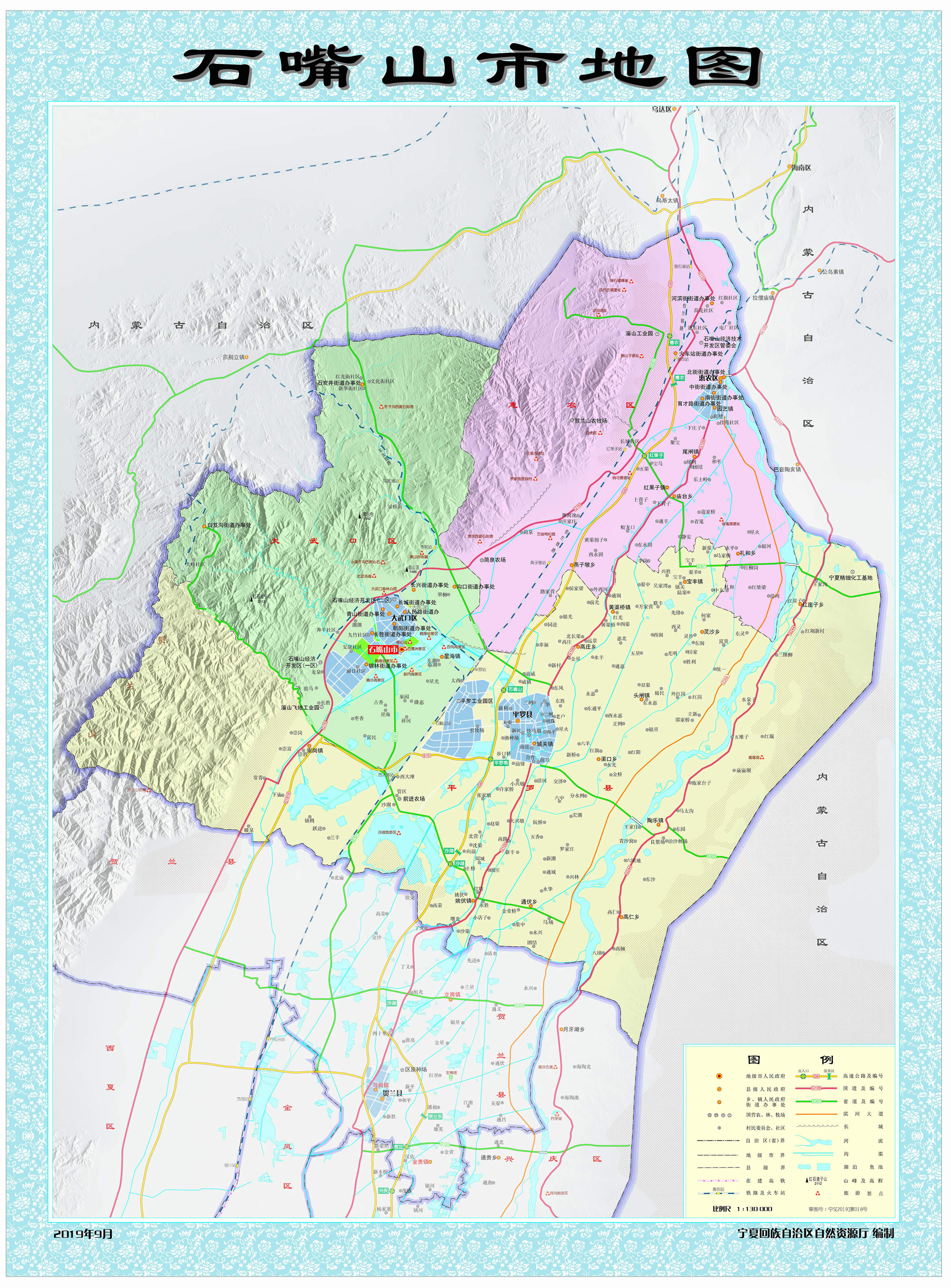 1975年11月23日,撤銷銀北地區(qū),恢復(fù)石嘴山市。石嘴山市因賀蘭山與黃河交匯處“山石突出如嘴”而得名,歷史悠久,秦朝時(shí)設(shè)渾懷障,西漢時(shí)設(shè)置第一個(gè)行政建制——廉縣,悠久歷史造就了厚重的文化底蘊(yùn),孕育了賀蘭山巖畫、古長(zhǎng)城、北武當(dāng)壽佛寺、平羅玉皇閣、田州塔等人文古跡,擁有移民文化、賀蘭山文化、工業(yè)文化等民宿文化;地理位置較為優(yōu)越,地處寧東、蒙西兩個(gè)國(guó)家千億噸級(jí)煤田之間,是呼包銀蘭經(jīng)濟(jì)帶、寧夏沿黃經(jīng)濟(jì)區(qū)、寧蒙陜?yōu)踅鹑墙?jīng)濟(jì)區(qū)的重要節(jié)點(diǎn)城市;距銀川河?xùn)|機(jī)場(chǎng)100千米,包蘭鐵路、京藏高速、烏瑪高速、109國(guó)道、110國(guó)道等貫穿全境,被列為國(guó)家公路運(yùn)輸樞紐城市、區(qū)域流通節(jié)點(diǎn)城市之一;黃河穿東過,西依賀蘭山,湖泊星羅棋布。市境內(nèi)有5A級(jí)旅游景區(qū)沙湖、國(guó)家水利風(fēng)景區(qū)星海湖等風(fēng)景名勝。