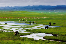 祁連山草原因交融之美,被評(píng)為“中國(guó)最美的六大草原”之一,具有面積大、草質(zhì)好、類型多、產(chǎn)草量高等特點(diǎn),有罕見的林中草場(chǎng)。海拔4000以上還有高山積雪形成的碩長(zhǎng)而寬闊的冰川地貌奇麗壯觀。進(jìn)入祁連境內(nèi),放眼望去,滿目盡是草原旖旎的風(fēng)光。夏季的草原像是廣袤無(wú)垠的綠毯,滿山的白藏羊恰似散落的珍珠,黑色的牛毛帳篷、裊裊升起的炊煙、牧人悠揚(yáng)的歌聲,這一幕如畫風(fēng)景卻是草原最尋常的景色。