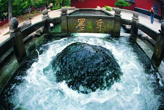 為濟(jì)南七十二名泉之一。位于百脈泉公園龍泉寺西南側(cè),泉池呈方形,漢白玉雕砌,正常年流量0.3立米/秒。泉孔黝深,水色蒼蒼如墨而得名。泉眼直徑0.4米,泉水騰涌而出,水清透明,泉水黝深,故名“墨泉”。墨泉水出自深部奧陶紀(jì)石灰?guī)r巖溶裂隙,盛水期泉流量0.5立方/秒,水柱沖出泉口,聲如雷鳴,雪濤飛濺。注入石渠,浩浩而下,有“一泉成河”的美譽(yù)。泉池前后刻“墨泉”二字,為大書(shū)法家舒同先生題寫(xiě)。字體方正渾厚,“頗具魏晉飄逸之氣,含篆籀之義理,得分隸之謹(jǐn)嚴(yán)”,墨泉所在位置1966年-1980年曾是章丘縣委家屬住院,時(shí)任章丘縣委書(shū)記的舒同先生居此。