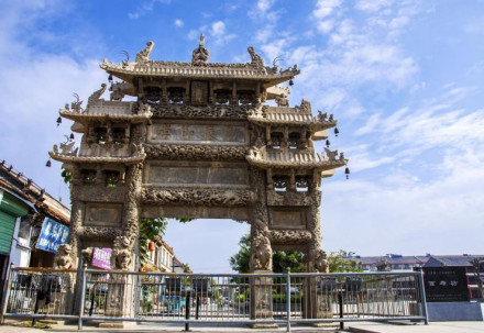 是典型清代石雕建筑,俗稱張家牌坊,被譽為“天下第一坊”,位于牌坊街中段。因其夾柱精雕一百個姿態(tài)各異的石獅子而得名,寓有“百事(獅)如意,百世(獅)多壽(獸)”之意。乃清乾隆四十三年(1778年)為贈文林郎張蒲妻朱氏而建,全石結構,高14米,寬9米,四柱三間五樓式,正間單檐,次間正檐,歇山頂,全部石砌。坊座八根夾柱透雕群獅八組,大獅子獰猛崢嶸,小獅子環(huán)繞戲耍。每根夾柱前、左、右三面均浮雕松獅圖。四柱和枋額上透雕云龍,其它部位也透雕加浮雕云龍旋舞,珍禽異獸、花卉圖案。
