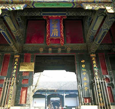 孔府位于曲阜城的中心,坐北朝南,迎面是一個(gè)粉白的大照壁,門前左右兩側(cè),有一對(duì)2米多高的圓雕雌雄石獅。紅邊黑漆的大門上鑲嵌著狻猊鋪首,大門正中上方的高懸著藍(lán)底金字的“圣府”匾額,門兩旁明柱上,懸掛著一對(duì)藍(lán)底金字對(duì)聯(lián):與國(guó)咸休安富尊榮公府第,同天并老文章道德圣人家。這副對(duì)聯(lián)相傳是清人紀(jì)均的手書(shū)。文佳字美,形象地說(shuō)明了孔府在封建社會(huì)中的顯赫地位。這副對(duì)聯(lián)口氣之大自不待言,發(fā)人深思的是上聯(lián)“安富尊榮”的富字,下聯(lián)“文章道德”的章字,從上圖可以看出,“富”字上少了一 點(diǎn),“章”字中多了一筆,意思是說(shuō)衍圣公官職位列一品,田地萬(wàn)