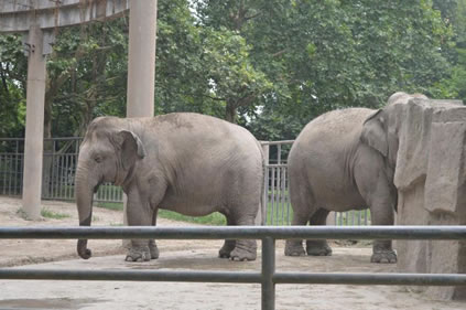 上海動物園飼養(yǎng)有國內(nèi)動物園少有的三代同堂的亞洲象家族。象展區(qū)包括象宮和象室外活動場兩部分。象宮建成于1955年,是上海動物園第一幢永久性的動物館舍,總建筑面積1550平方米,主要包括500平方米室內(nèi)活動場、620平方米參觀廳和100余平方米的4個門廳。室內(nèi)活動場的東、西、南三面都是寬9米的參觀廳,參觀廳進出口的門廳東、西各有一個,南面分左右二個,南面二門廳間外有紫藤棚架相連。整個建筑的門窗都用杉木拼雕成具有民族風格的圖形裝飾。