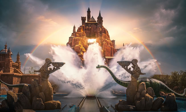 逃出恐龍島是以吳哥窟為主要建筑風(fēng)格的大型室內(nèi)漂流歷險主題項(xiàng)目,游客將乘坐小車進(jìn)入危險的侏羅紀(jì)時代,在茂密的叢林里展開一場驚心動魄的冒險。巨型恐龍的隆隆腳步震動著大地、頭頂上盤旋著空中獵手、巨石突然從眼前滾落,緊張和恐怖彌漫四周。隨后游船從幾十米高的懸崖瀑布上急速下墜,讓游客在驚叫聲中經(jīng)歷一場永生難忘的恐龍島冒險之旅。