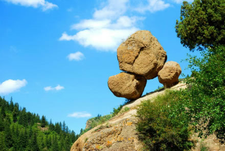 寧武縣城30公里處的東寨鎮(zhèn)西樓子山南麓半坡,有一座峭巖矗立于溝側(cè)溪畔。這峭巖高約兩丈余,頂部巍巍托起一塊巨大奇石。這奇石以兩塊小石作支腳,立于約三四十度的峭巖斜坡頂部。奇石高約3米,闊約2米。雖立斜坡,風吹似動,但數(shù)干百年來,它卻一直屹立在那里。由于奇石狀似加蓋的鍋,支撐它的兩小石形若鍋腳,故而人稱“支鍋奇石”,成為古寧武府和寧武縣八大奇景之一。據(jù)關專家考察,該奇石形成于第四紀冰川期。