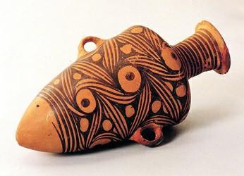 繪畫圖案古樸、簡練,可分三大類:一類為象生性圖案,如張口作吞食狀的魚、悠閑的鹿、搜索食物的蛙等動物紋,還有植物紋。這些象生圖案同史前人類的生活息息相關,形態(tài)生動的動植物紋樣是農耕和漁獵生活的反映。第二類為幾何圖案,有三角形,方格紋、編織紋等,這類圖案多在缽、罐、盆、壺類器皿外璧上部,許多缽類器口緣外側繪黑色寬帶紋,部分大口淺腹器皿的彩陶圖案多繪在內壁上,小口器的圖案則繪在口唇和肩腹部,這些部位多是容易看得見的地方,多數(shù)圖案清晰,筆畫疏朗,這些幾何圖案中,三角紋是由魚紋圖案變化而來,波折紋則是山或水的寫意。