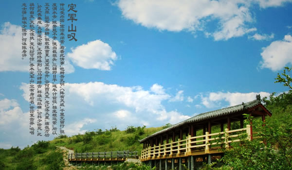 定軍山:定軍山位于陜西省漢中市勉縣城南5千米,三國(guó)時(shí)期古戰(zhàn)場(chǎng)。為省級(jí)風(fēng)景名勝區(qū)。原屬武侯墓鄉(xiāng),今屬定軍山鎮(zhèn)轄區(qū)。三國(guó)時(shí),蜀將黃忠斬夏侯淵、趙顒?dòng)诖,在歷史上遂負(fù)盛名。屬大巴山脈,其脈自高廟子入平地,隆起秀峰12座,自石山子至元山子,號(hào)稱“十二連峰”,再東為當(dāng)口寺孤峰,自西向東綿延十多公里,如游龍戲珠,故有“十二連山一顆珠”之譽(yù)。主峰定軍山為最高處,海拔833米,山頂原有“古定軍山”石碑,文革被毀,今新立。山南有一個(gè)天然鍋底形的大洼,周長(zhǎng)1.5千米,即三國(guó)時(shí)稱為“可屯萬兵”的“仰天洼”。北麓有一片廣漠沃野,就是當(dāng)年諸葛亮大布“八陣圖”、設(shè)“督軍壇”的武侯坪,黃忠大戰(zhàn)夏侯淵的戰(zhàn)場(chǎng),時(shí)常發(fā)現(xiàn)“扎馬釘”和箭鏃,傳為蜀軍用兵之物;山旁有“斬將橋”,“八角琉璃井”井口八角形,薄頁(yè)細(xì)花紋漢磚砌成,皆不存。山半腰有一大石,高約3.3米,寬約2米,中開一縫,寬窄不一,名曰“擋箭牌”,傳為諸葛亮遮擋敵箭的遺物。