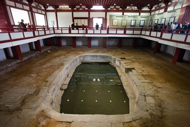 御湯遺跡:1982年4月,華清池內基建時,在今“貴妃池”西側發(fā)現(xiàn)了古建筑基址,省文管會考古隊即開始發(fā)掘考證。用了3年多時間發(fā)掘了約4000平方米的面積,發(fā)現(xiàn)了一條長18米、寬5.1米的唐代蛇形水源通道和4座青石砌成的浴池,還有大殿基址4處,發(fā)現(xiàn)30多米長的石墻和兩處蓮花踏步,總長400多米的陶管水道,長50米的磚砌水道及建筑材料多件。1983年7月,考古工作者在溫泉總源北部發(fā)掘出一個東西長10.6米,南北寬6米,深1.5米。輪廓呈蓮花瓣形的浴池遺址,池底及四周均用青石鋪砌,池內有兩層臺,池底南有兩個圓形水口。專家根據史籍記載華清宮的御池方位、形制、規(guī)模和發(fā)現(xiàn)的浴池四周的大殿基址和柱礎等,認為是唐玄宗使用的九龍殿蓮花湯。1984年10月在緊挨蓮花湯西北處,發(fā)掘出一個保存完好的海棠花形狀的浴池,東西長3.6米,南北寬2.9米,深1.26米,用青石砌成,池內有二層臺階,池底正中有一圓形水口,做工考究,雕刻精細,專家認為是“海棠湯”,即唐玄宗御賜楊玉環(huán)的“貴妃池”。在蓮花湯西南還發(fā)掘出一個東西長5米,南北寬2.7米,深1.2米,用青石鋪砌的長方形浴池。據文獻記載推測,應是“太子湯”。經考證,這些古建筑遺存與史志書記載完全吻合,是一組較完整的唐華清宮建筑遺址,也是華清宮的中樞所在,為唐玄宗和貴妃游幸時活動的主要場所。期已經全面整理,并仿唐形制,建成“唐華清宮御湯遺址博物館”供游人參觀。