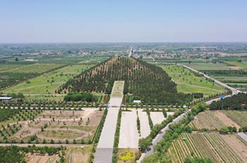 上述與今測量數(shù)字基本相符?傉嫉孛娣e計為56878.25平方米,封土體積848592.92立方米。陵園四周呈方形,平頂,上小下大,形如覆斗,顯得莊嚴穩(wěn)重。