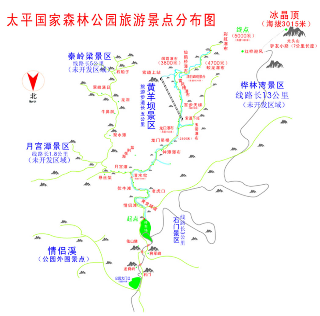太平國(guó)家森林公園位于陜西省西安市戶縣太平峪內(nèi)。距西安44公里,咸陽(yáng)60公里,總面積6085公頃。海拔在880米-3000米之間,最高是冰晶頂3015米。年均氣溫7-10℃,最高氣溫29℃。屬于冰晶頂韌性剪切帶與構(gòu)造混合巖化園區(qū)。園內(nèi)植物資源豐富、種類繁多,國(guó)家保護(hù)一、二類動(dòng)物30多種。
