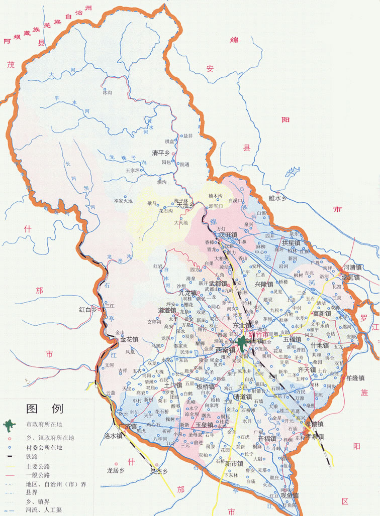 鎮(zhèn):劍南鎮(zhèn)、玉泉鎮(zhèn)、什地鎮(zhèn)、富新鎮(zhèn)、孝德鎮(zhèn)、新市鎮(zhèn)、板橋鎮(zhèn)、興隆鎮(zhèn)、金花鎮(zhèn)、廣濟鎮(zhèn)、土門鎮(zhèn)、遵道鎮(zhèn)、綿遠鎮(zhèn)、拱星鎮(zhèn)、九龍鎮(zhèn)、漢旺鎮(zhèn)、齊天鎮(zhèn)、西南鎮(zhèn)、東北鎮(zhèn)