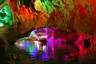 由南天門(mén)往右,沿著崎嶇的“盤(pán)陀路”進(jìn)入第二殿,隨著“一柱廳”、“半天山”到達(dá)約有450平方米寬的“東海龍宮”那里“定海神針”直立,“五彩神泉池”水色清澈晶瑩,不寒而栗有“白龍?jiān)浇瓓Z寶”、“頑猴望”、“海獅戲蓮”、“別甲神鷹鎮(zhèn)金沙”、“龍王百寶箱”等天然造型,氣勢(shì)磅礴,極為壯觀。龍宮內(nèi)洞中有洞、景中有景!拔淞陥@”有牛角尖、簸箕天,海螺洞中有“鶴蚌相爭(zhēng)”、“海螺觀戰(zhàn)”、“鳴鑼助戰(zhàn)”、“石床”等石筍、鐘乳石造型,相映成趣,目不暇接。然而,“山有洞天不算奇,陰河劃船數(shù)第一”。沿著灣灣曲曲的跳蹬路,耳聽(tīng)潺水聲,觀看“地海橫鯨”、“青蛙駝蓮”、“天地桃”、“美猴照鏡”等景點(diǎn)來(lái)到陰河劃船處——“凱旋門(mén)”、只見(jiàn)幽幽碧水,微泛漣漪,各種燈光倒映水中的燈景冉冉浮動(dòng)。
