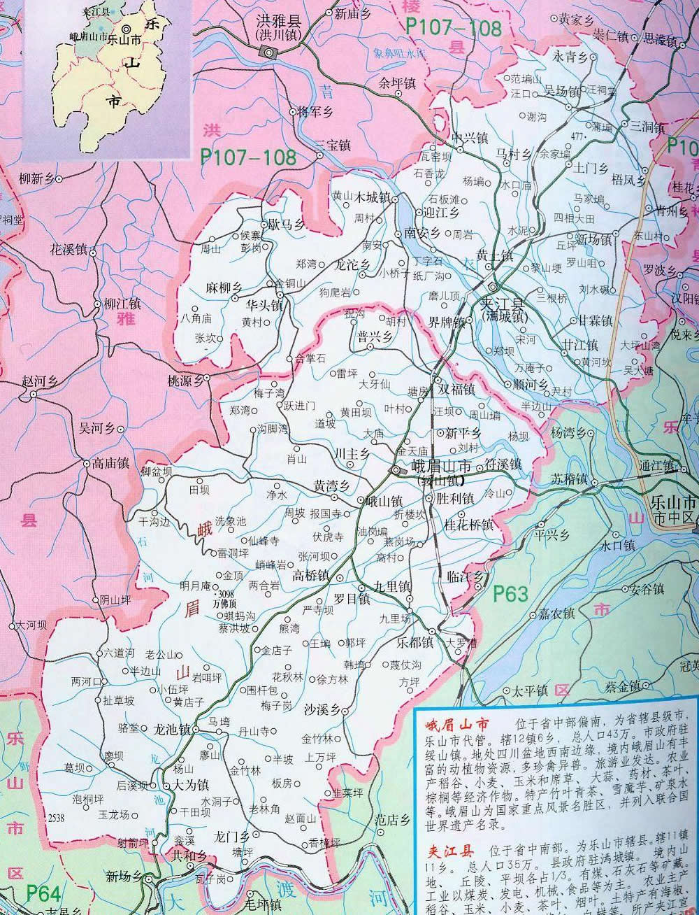 鎮(zhèn):綏山鎮(zhèn)、九里鎮(zhèn)、羅目鎮(zhèn)、龍池鎮(zhèn)、樂(lè)都鎮(zhèn)、峨山鎮(zhèn)、大為鎮(zhèn)、符溪鎮(zhèn)、雙福鎮(zhèn)、高橋鎮(zhèn)、桂花橋鎮(zhèn)、勝利鎮(zhèn)