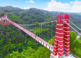 七洞溝9D云海玻璃橋橫騎南屏山山脈與佛來山山脈峽谷之上,全長386米,寬3.3米,垂直落差188米,在中國西南部地區(qū)長、寬、高都名列第一,是長寧旅游大發(fā)展靚麗新畫卷之一。玻璃橋采用最新9D技術(shù),以仿真場景與感應(yīng)設(shè)置模擬多種特殊效果、立體畫面,將視覺、聽覺、觸覺和動(dòng)感完美地融為一體,給游客帶來驚心動(dòng)魄的刺激感受。走在橋上,不僅可以俯瞰綿溪河,還可以飽覽南屏山脈、佛來山脈等2座群山的英姿;晴天時(shí),藍(lán)天和白云的倒影鋪滿天橋,讓人在對(duì)透明的腳下戰(zhàn)戰(zhàn)兢兢之余,更樂享于踏云而行的快感;而云霧天氣時(shí),玻璃橋則在霧中若隱若現(xiàn),天上人間的美景更是讓人驚嘆不已。