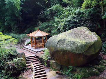 在綿溪河大峽谷東岸,有一塊紅色砂巖,凸兀于路旁,形狀如一只正在彈奏的彈琴蛙,人們把這塊巨石稱之為琴娃石。相傳明朝時(shí),周洪謨將一位名叫穆槐的小姑娘背過綿溪河,不想這位姑娘就此愛上周洪謨,從那以后,穆槐經(jīng);氐皆氐群,希望周洪謨再次出現(xiàn)。而她卻不知道周洪謨已經(jīng)外出求學(xué),再?zèng)]出現(xiàn)過。為了打發(fā)枯燥的等候時(shí)光,穆槐學(xué)會(huì)了彈琴,時(shí)間如綿溪河的流水,一去不復(fù)返,穆槐也由一位活潑可愛的小姑娘變成一位白發(fā)蒼蒼的老人,她的執(zhí)著和愛感動(dòng)了在此煉丹的太上老君,于是太上老君將穆槐變成一只活潑可愛的彈琴蛙,永遠(yuǎn)停留在這里彈琴,等候周洪謨的到來。而今,除了冬季,每到夜晚,在琴蛙石都可以聽見穆槐‘叮叮、咚咚’的彈琴聲。
