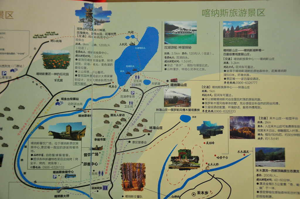 喀納斯景區(qū)內(nèi)共有大小景點(diǎn)55處,分屬33種基本類型,主要包括哈納斯國(guó)家級(jí)自然保護(hù)區(qū)、喀納斯國(guó)家地質(zhì)公園、白哈巴國(guó)家森林公園、賈登峪國(guó)家森林公園、喀納斯河谷、禾木河谷、那仁草原、禾木草原及禾木村、白哈巴村、喀納斯村等國(guó)內(nèi)外享有盛名的八大自然景觀區(qū)和三大人文景觀區(qū)。