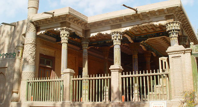香妃墓是阿帕霍加墓的別稱,坐落在喀什市東北郊5公里處的浩罕村,是伊斯蘭教白山派首領(lǐng)阿帕克霍加及其家族的墓地,占地面積30畝,始建于公元1640年前后,是典型的伊斯蘭式古陵墓建筑。