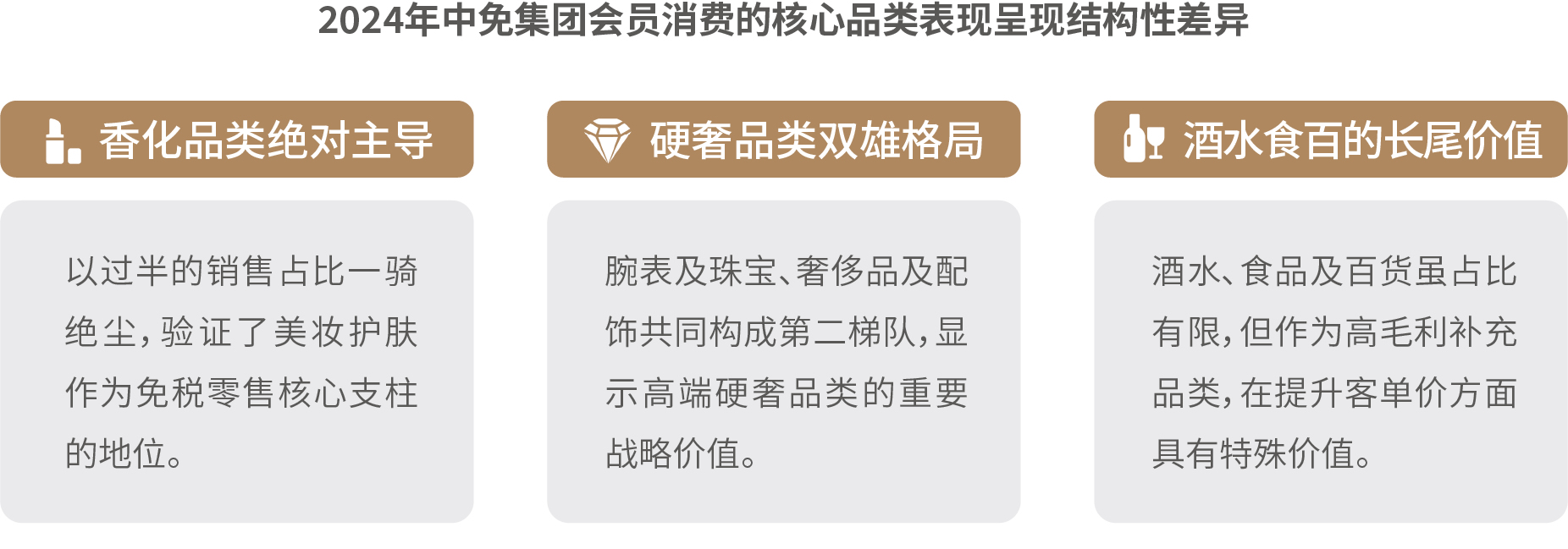 在核心品類消費維度,彩妝香水增長亮眼,外籍旅客、男性客群、國潮品牌成為品類重要的增長點;奢侈品及配飾方面,消費結構多元化,超高端市場增長顯著,輕奢區(qū)間保持穩(wěn)定需求;腕表及珠寶方面,品類分化顯著,首飾品類同比增長,腕表需求區(qū)域性特征突出;酒水方面,市場擴容升級,品類及人群消費分層顯著,渠道互補發(fā)展,呈現(xiàn)出規(guī)模擴張與結構升級并行的顯著特征;食品及百貨方面,市場穩(wěn)健擴容,圈層特征鮮明,Z世代和銀發(fā)人群正在引發(fā)新的情感和健康消費變革。