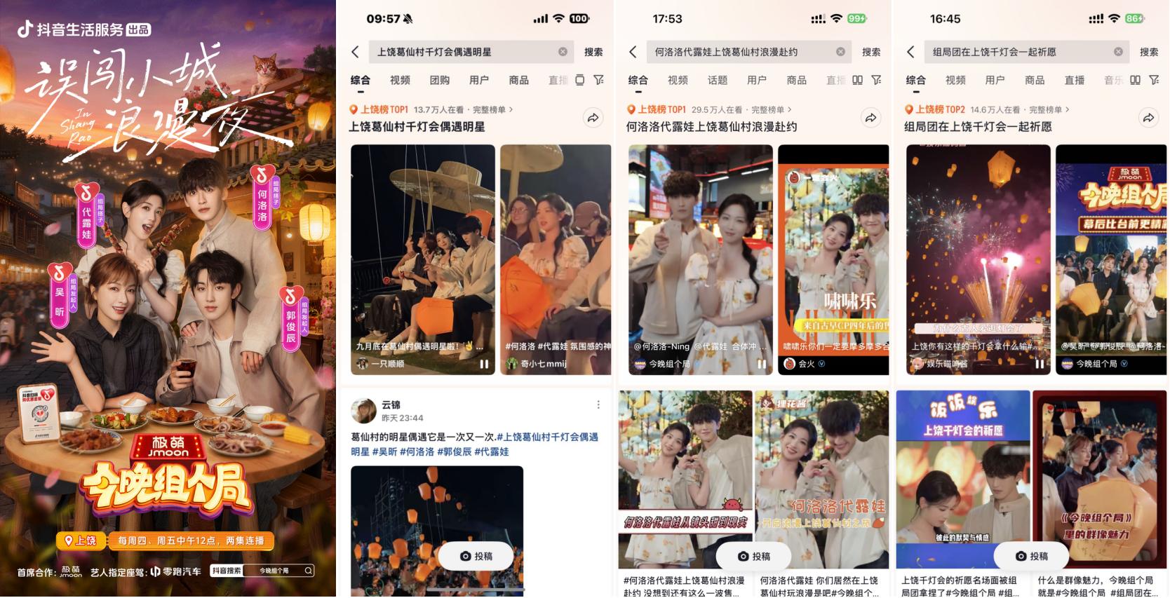 抖音牽手“秋日男友”魏哲鳴前往江西上饒葛仙村拍攝文旅宣發(fā)視頻引發(fā)廣泛關(guān)注,路透內(nèi)容#在葛仙村偶遇魏哲鳴 登上上饒同城榜TOP1;主視頻發(fā)布后,#江西的秋日封神時(shí)刻 更登頂同城榜及全國(guó)種草榜TOP6。活動(dòng)還與綜藝《今晚組個(gè)局》實(shí)現(xiàn)聯(lián)動(dòng),吳昕、代露娃、郭俊辰、何洛洛等明星演員前往上饒拍攝定制化文旅內(nèi)容,#上饒葛仙村千燈會(huì)偶遇明星 #何洛洛代露娃上饒葛仙村浪漫赴約 等路透內(nèi)容與節(jié)目看點(diǎn)登頂上饒同城榜TOP1,#組局團(tuán)在上饒千燈會(huì)一起祈愿 搶占同城榜TOP2。明星效應(yīng)有效激發(fā)用戶(hù)出行意愿,葛仙村交易額同比403%顯著增長(zhǎng),持續(xù)引爆目的地&商家出圈。