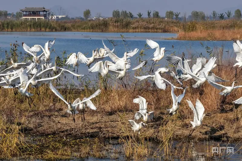廬江縣沿黃陂湖環(huán)境綜合整治退漁還湖規(guī)劃,整治總面積近20平方公里。這群白琵鷺的翩然而至,不僅是黃陂湖濕地生態(tài)環(huán)境建設(shè)成果的生動(dòng)體現(xiàn),也吸引了不少攝影愛好者和游客前來(lái)觀賞。大家紛紛在安全距離外,用鏡頭記錄下這人與自然和諧共處的美麗畫卷,見證著這片土地的蓬勃生機(jī)。