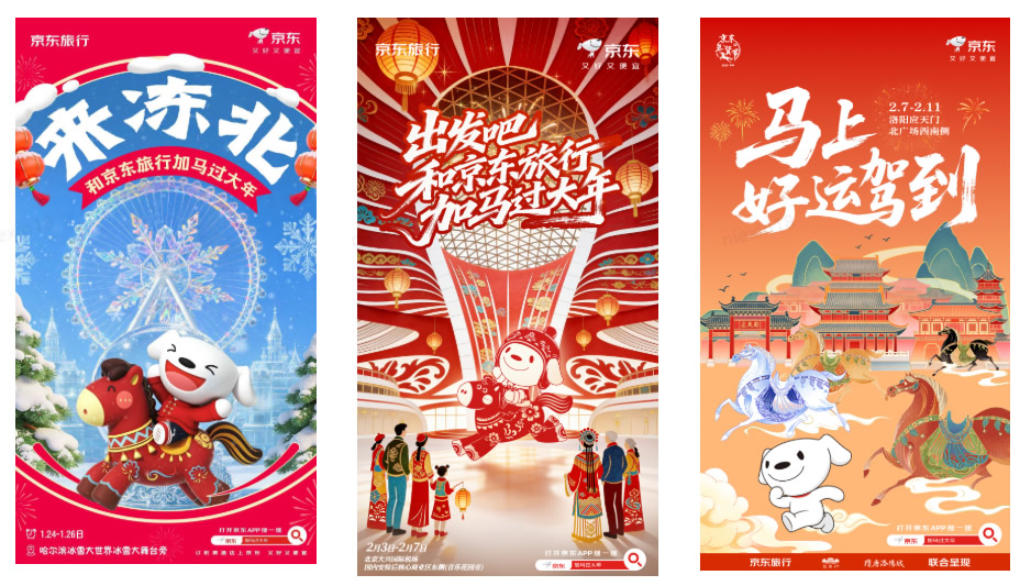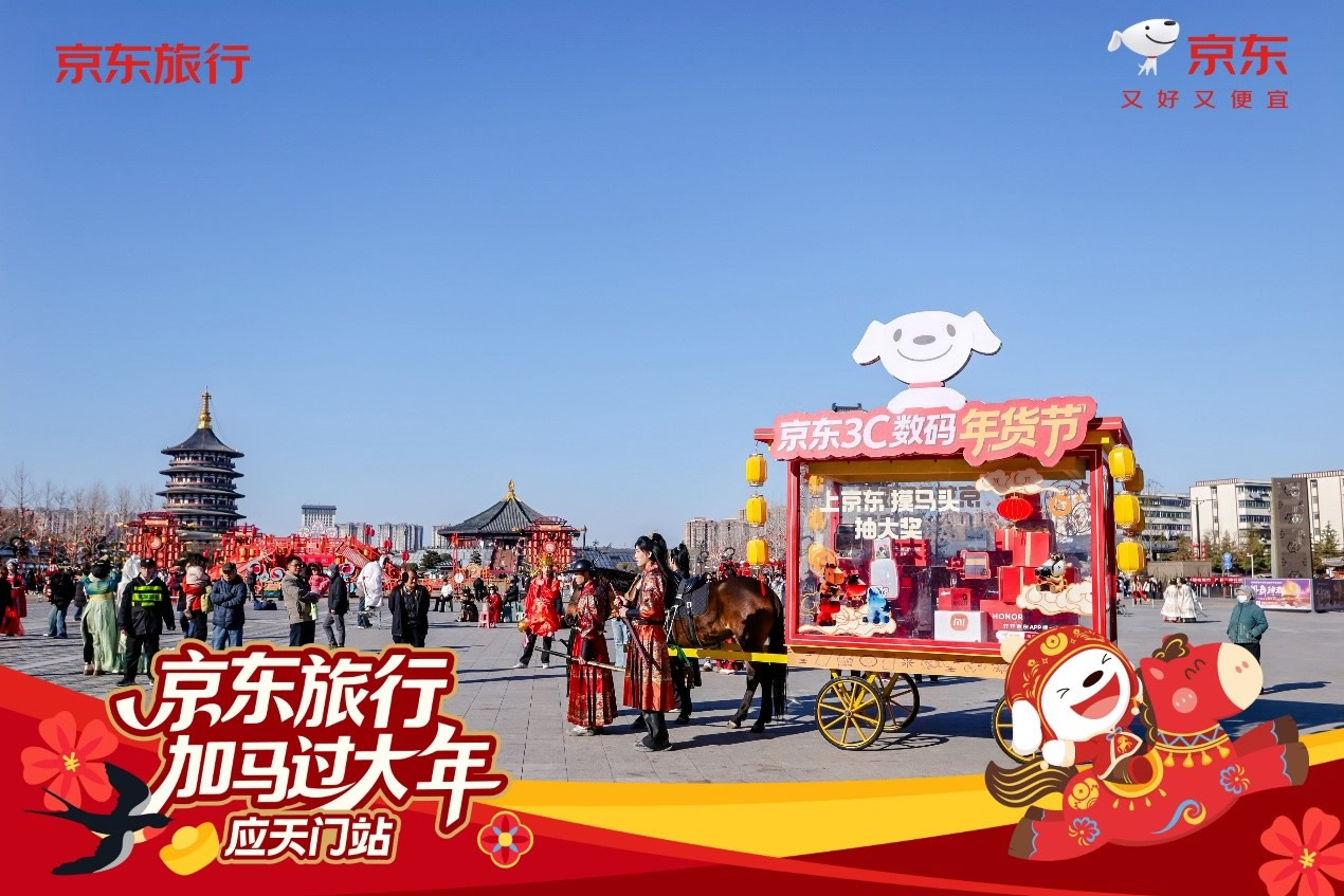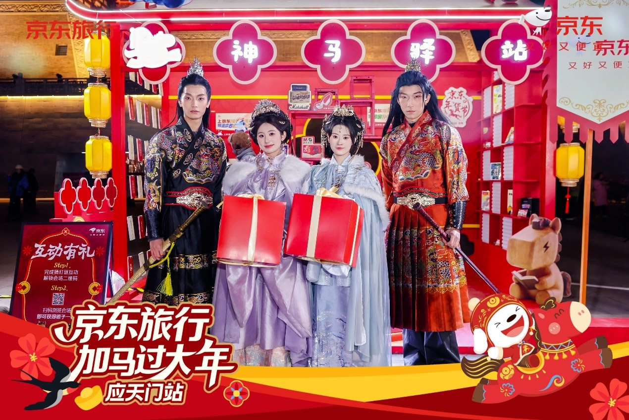 與此同時(shí),在洛陽應(yīng)天門景區(qū),京東旅行攜手京東數(shù)碼、京東物流、伊利等品類品牌,以“國(guó)風(fēng)快閃”為核心形式,融合真實(shí)馬匹巡游、唐風(fēng)NPC互動(dòng)、馬車送年貨等話題事件,將傳統(tǒng)文化場(chǎng)景與品牌產(chǎn)品自然嫁接,不僅強(qiáng)化了景區(qū)文化體驗(yàn)的鮮活感,更通過“真馬營(yíng)銷”等創(chuàng)新手段在社交平臺(tái)形成二次傳播,成功塑造了“文旅+品牌”的場(chǎng)景營(yíng)銷新范式。