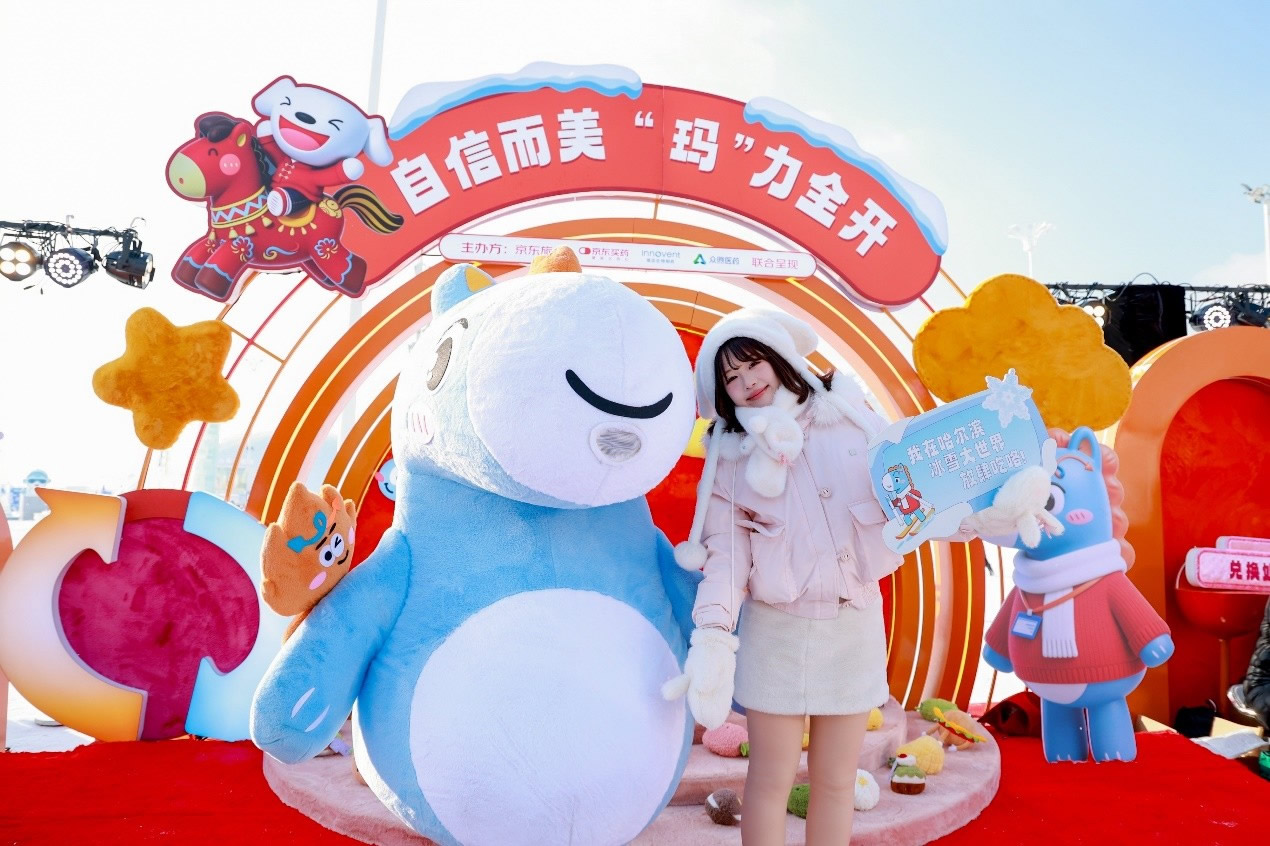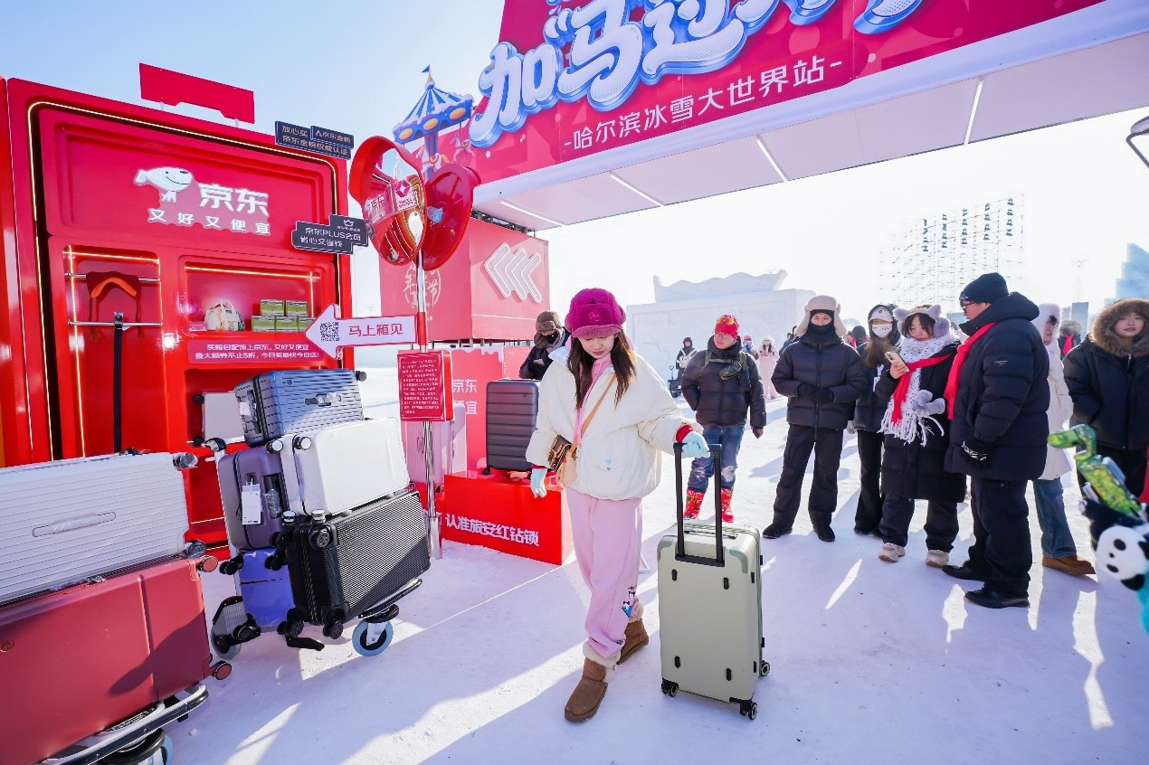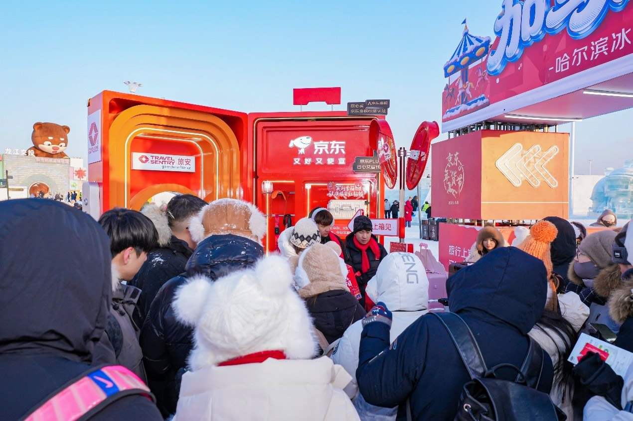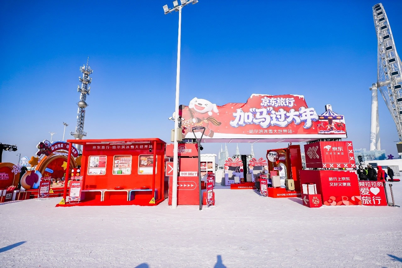 京東旅行在此次年貨節(jié)中深度融合兩大頂流文旅場(chǎng)景,實(shí)現(xiàn)線下事件與品牌傳播的雙重引爆。在哈爾濱冰雪大世界,京東旅行攜手京東箱包、京東健康、超級(jí)品牌聯(lián)盟、旅安、歐舒丹等品類品牌,依托其冬季頂流景區(qū)的話題熱度,通過多維互動(dòng)營(yíng)銷方式打造沉浸式跨界體驗(yàn):不僅設(shè)置“冰雪年貨快閃活動(dòng)”開展品牌展示與互動(dòng)游戲,更通過地標(biāo)冰雪摩天輪、無人機(jī)表演、冰雪大舞臺(tái)廣告/立體字/主持人口播、區(qū)域植入品牌立體廣告等豐富營(yíng)銷形式,共同實(shí)現(xiàn)品牌與景區(qū)流量的深度共振。