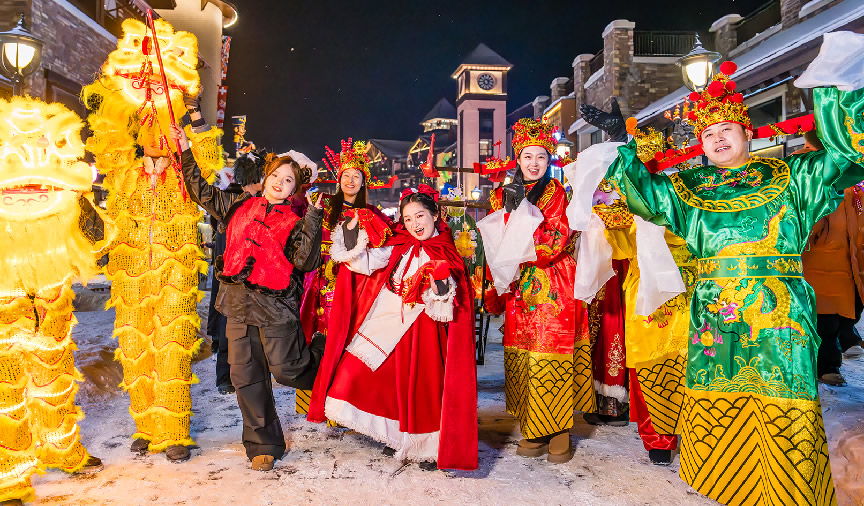 夜幕降臨,巡游隊(duì)伍走上度假區(qū)的街頭,讓游客在冰天雪地中感受到濃濃熱情。