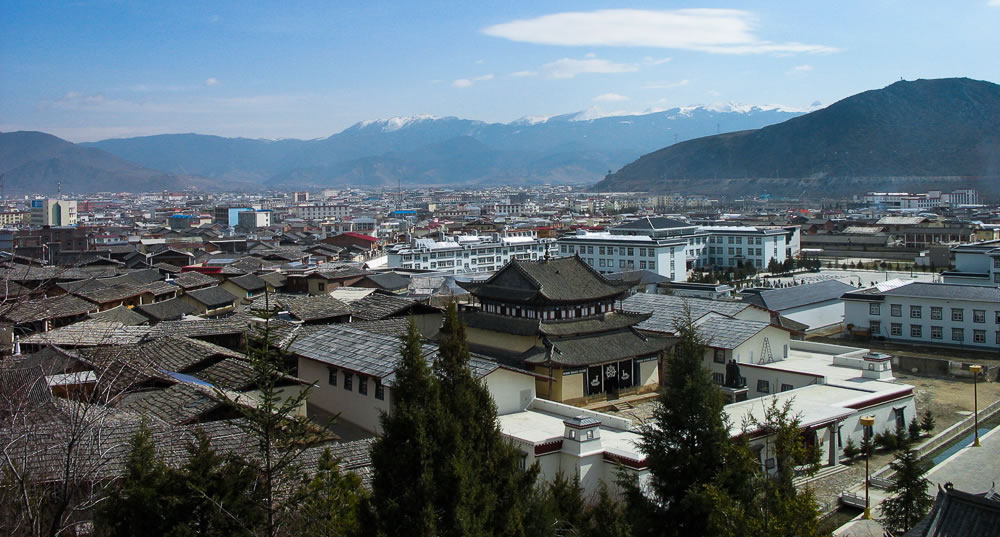 該寺又稱(chēng)歸化寺,距中甸縣城5公里,是一座古鎮(zhèn)規(guī)模的古堡群建筑。于公元1679年(藏歷第十一繞迥陰土羊年)興建,公元1681年(陰鐵雞年)竣工。五世達(dá)賴(lài)?yán)镉H賜名“噶丹·松贊林”。