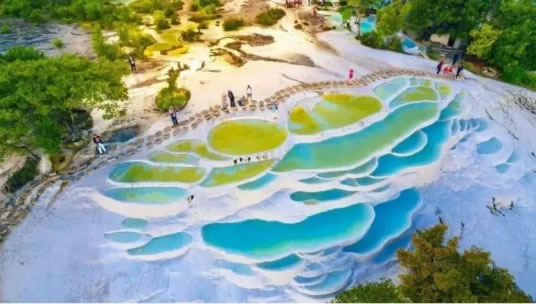 白水臺(tái)因碳酸鹽長(zhǎng)年累月的沉淀,形成臺(tái)幔,好似層層梯田,故有“仙人遺田”的美稱(chēng),2022年11月9日,白水臺(tái)景區(qū)被確定為國(guó)家AAA級(jí)旅游景區(qū)。