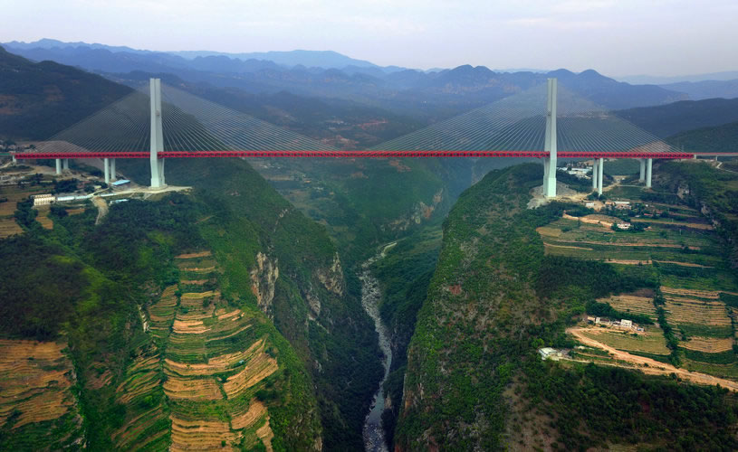 北盤(pán)江第一橋地處云南省宣威市普立鄉(xiāng)臘龍村與貴州省六盤(pán)水市水城縣都格鄉(xiāng)交界處,位于云南省宣威市普立鄉(xiāng)尼珠河,是杭瑞高速公路控制性橋梁工程,坐落于滇東北的崇山峻嶺中,大橋全長(zhǎng)1341.4米,主跨720米,為世界最大跨徑的鋼桁架梁斜拉橋。
