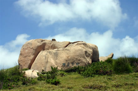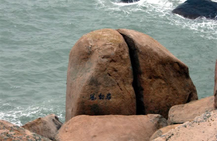 能以人力或風(fēng)力推動(dòng)而搖擺的大巖石,在各地勻有發(fā)現(xiàn)。南麂三盤(pán)尾石門(mén)旁的風(fēng)動(dòng)巖卻別有情趣。此石高約5.5米,直徑4米,形如銅鼓,卻裂成兩瓣,一瓣是“靜如處子”分外端莊;另一瓣,凡遇上5級(jí)以上大風(fēng),便自行搖動(dòng),可謂“動(dòng)似脫兔”,還以發(fā)出悅耳聲響,宛如海底傳來(lái)的進(jìn)軍號(hào)角。倘若無(wú)風(fēng)時(shí),那只得勞駕游客,憑力氣去推、去搖。面對(duì)風(fēng)動(dòng)巖了,聯(lián)想起佛教中關(guān)于“風(fēng)動(dòng)也,情動(dòng)也,見(jiàn)仁者自己心動(dòng)”的“因緣和合”典故,似乎明白了自然景觀中也充滿生活哲理。此巖其自身根基不穩(wěn),加上風(fēng)的外力,便顯得搖擺不定。