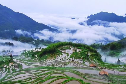 乍看似無(wú)序的曲線(xiàn),在眩目的平臺(tái)狂歡,扭動(dòng)的身姿沒(méi)有雷同的,田塊的形狀沒(méi)有相似的,草色花色水色天色沒(méi)有凝固的,景隨步移沒(méi)有不變的,泥房炊煙、耕牛犁田、牧童短笛沒(méi)有靜止的……,畬漢兩族農(nóng)人,千年生命接力,用一種筑田岸、鏟田坎的古老技術(shù),向大自然求愛(ài),創(chuàng)造云和古老的童話(huà)世界。這就是云和梯田——中國(guó)最美梯田。