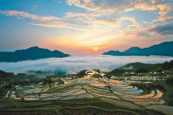 云和梯田如同一位四季美人:春穿花衫,水滿(mǎn)層疇:夏披綠紗,禾海滾浪;秋著紅裳,金穗漫山;冬裹銀裘,雪毯素裝。年復(fù)一年,山花不敗,鳴禽百?lài)剩魅唤。日?fù)一日,從山嵐染成金玫瑰,到白云變幻成蒼狗,一幕幕展現(xiàn)大自然造型和著色的奇詭。